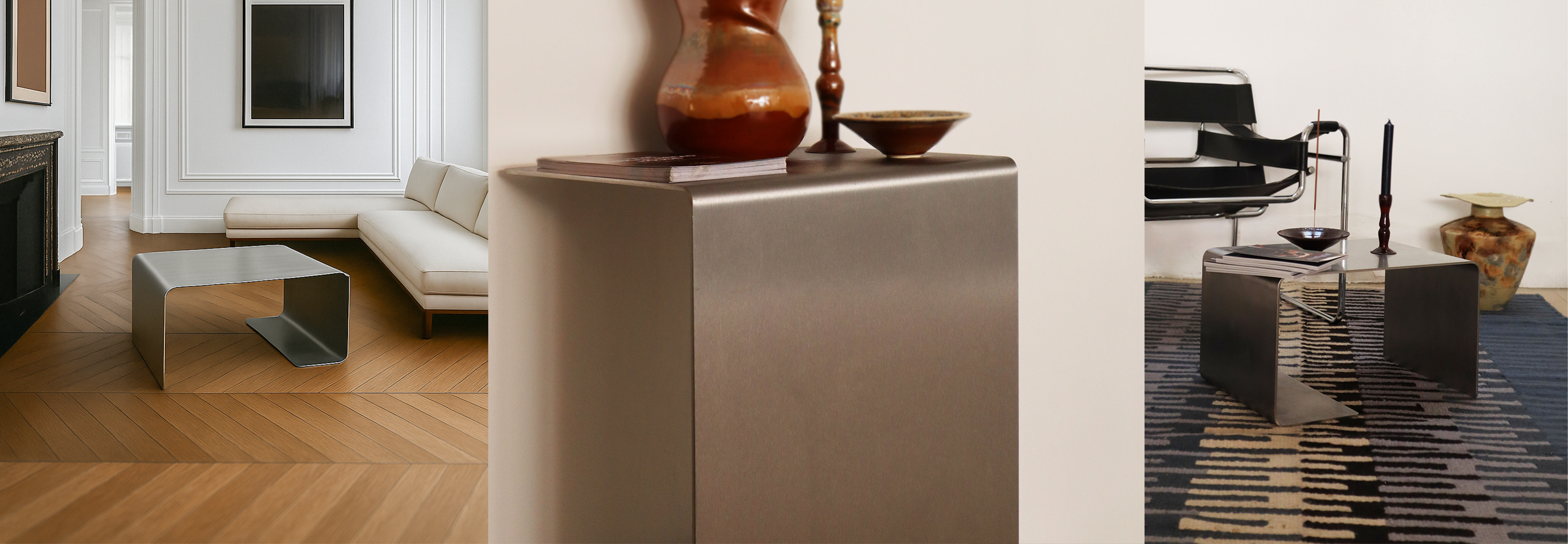 Crafted from a single sheet of dense brushed stainless steel, the T-02 Coffee Table embodies a refined industrial elegance. Its raw materiality lends it a distinct character, with subtle imperfections—fine scratches and gentle markings—that enhance its individuality and reinforce its honest, tactile appeal.