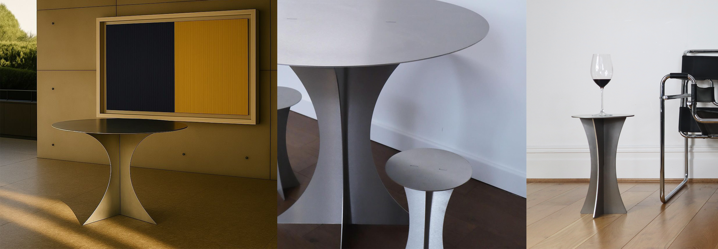 The T-01 Stainless Steel Table is a striking sculptural piece, born from an exploration of materiality and process. Standing upright with a subtle, trophy-like presence, its gently bowed form lends a quiet sense of regality.