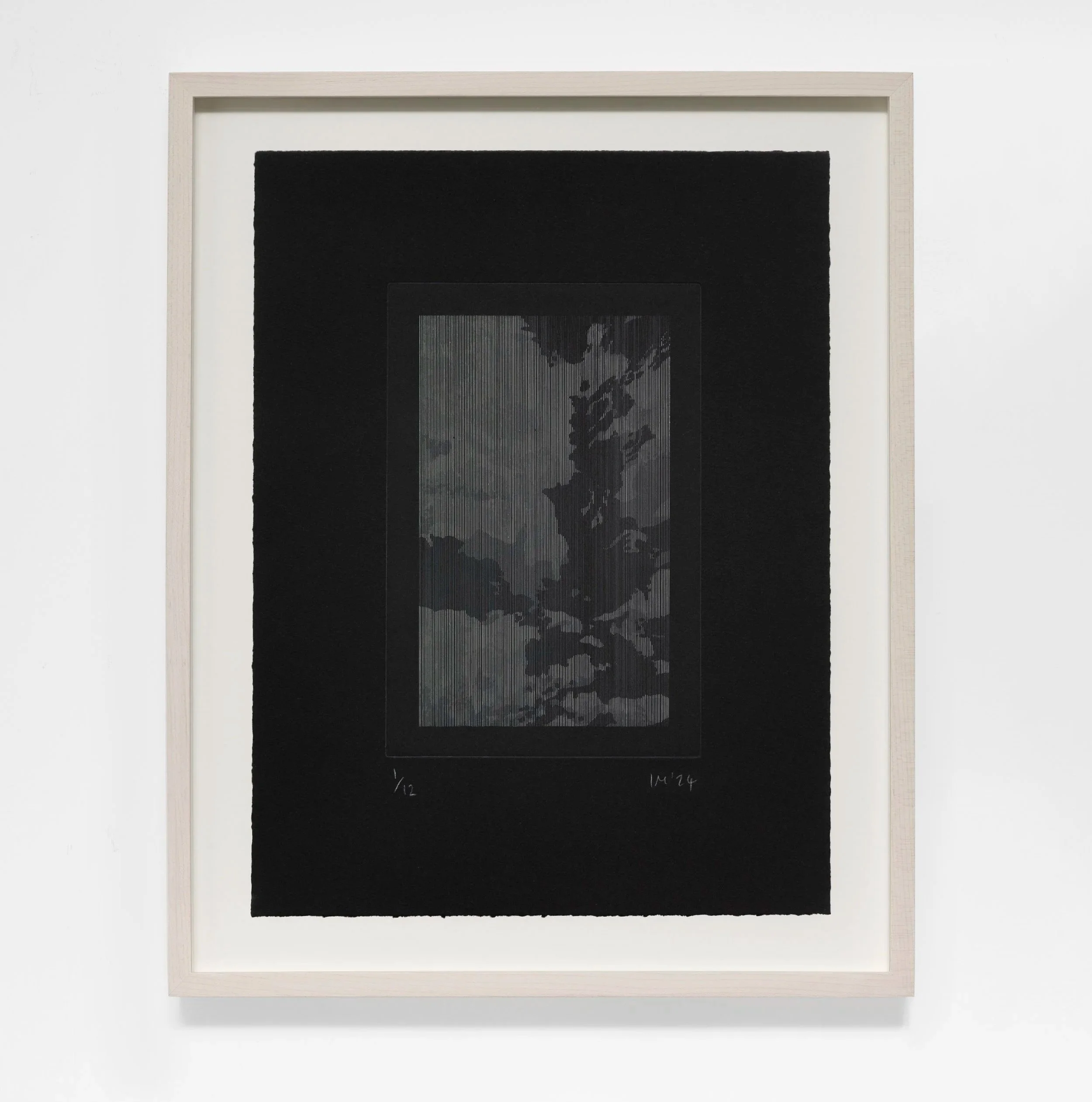 Each of the vertical lines are drawn onto the plate by hand, before the night sky is etched in layers of painted acid. Combating the substrate of vertical lines with gestural marks, Malhotra creates tones through unique variation in each continuous line. In doing so, he rails against the binary structure that underpins so much of our society, and reasserts the complex, fluid, human process of seeing and creating, present even within what initially looks like a mechanically produced image.